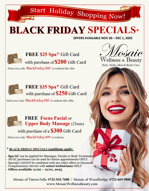 Mosaic Wellness & Beauty gift certificate makes a perfect gift for loved one or someone special. Comes packaged in a beautiful gift box with a gold bow.